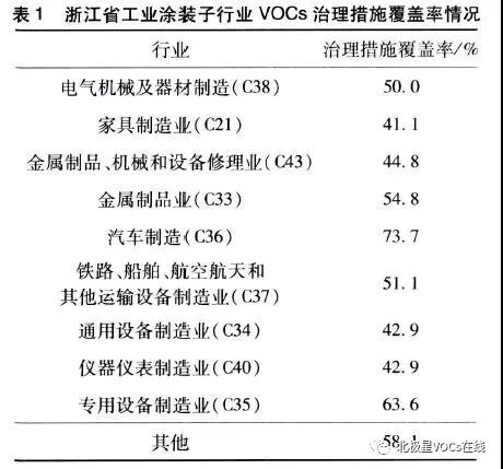 按工業涂裝國民經濟子行業進行分類統汁,浙江省工業涂裝子行業VOCs治理措施覆蓋率情況見表1。